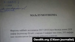 В распоряжении редакции «Озодлика» имеется документ, подтверждающий сбор денег в ферганском медколледже для осиротевших студентов и учащихся из малообеспеченных семей.