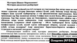 В жалобе, копия которой была также отправлена в редакцию «Озодлика», предприниматели утверждают, что земельный участок, на котором находятся магазины предпринимателей, был передан ООО URBAN DEVELOPERS с серьезным нарушением действующих законов.