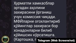 В распоряжении редакции «Озодлика» имеется скриншот переписки в мессенджере Telegram, в которой ответственным лицам махаллинских сходов граждан поручают проверять у жителей района запасы овощей на зиму.