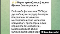 По словам источников «Озодлика», данные мероприятия, начавшиеся в Самаркандской области, проводятся по всей стране. Представителей системы предупредили не публиковать информацию по этому поводу в социальных сетях.