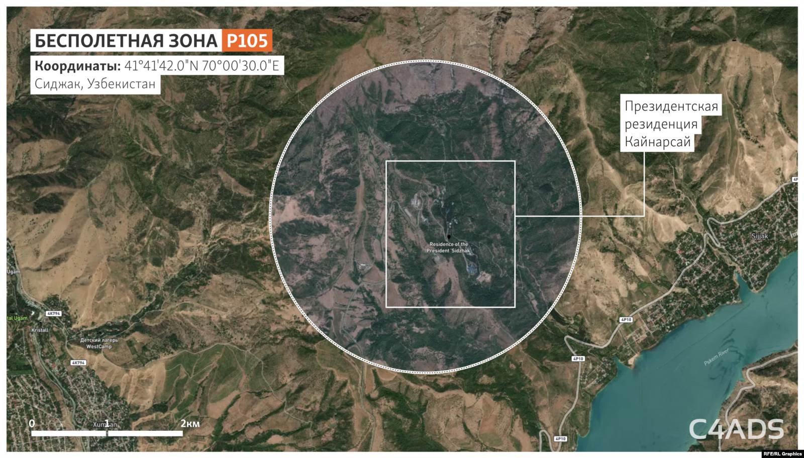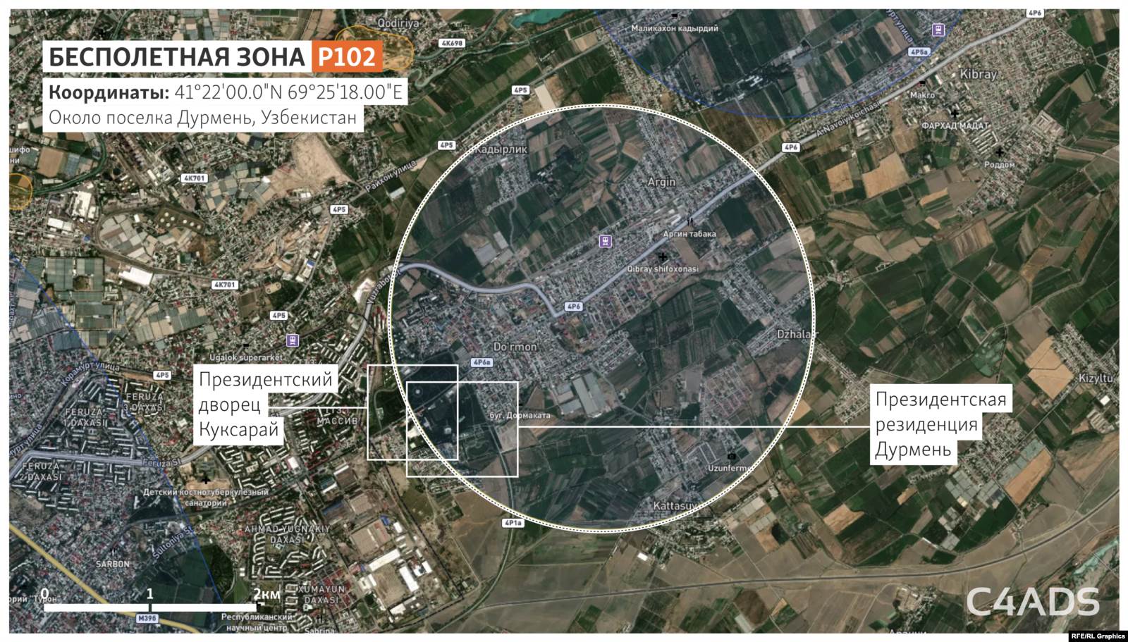 Центр этой бесполетной зоны находится над благоустроенным садово-парковым горным участком примерно в 200 м от двух вертолетных площадок и в 350 м от особняка, построенного, по данным источников, для Мирзиёева.