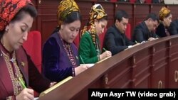 11 февраля на кадрах со встречи президента Туркменистана Гурбангулы Бердымухамедова с депутатами парламента, которая транслировалась по гостелевидению, можно наблюдать, как чиновники делают какие-то записи в зеленые тетрадки зелеными ручками.